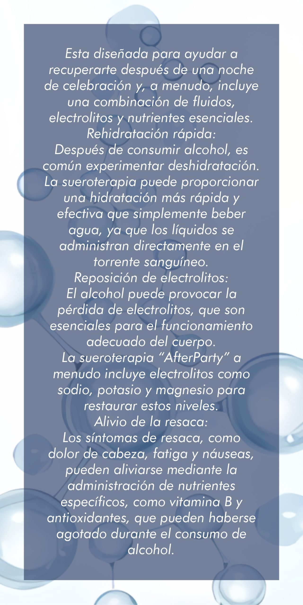 AFTER PARTYFORMULATED TO REVITALIZE YOUR BODY BY RETURNING HYDRATION AND LOST ENERGY AFTER AN INTENSE DAY.Aumento de vitalidad y energía, auxiliar en la perdida de peso. CONTRATA AHORA